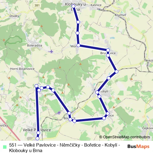 The first stop of the 551 bus route is Klobouky u Brna, náměstí and the last stop is Velké Pavlovice, autobusové nádraží. 551 (Velké Pavlovice - Němčičky - Bořetice - Kobylí - Klobouky u Brna) is operational during denně.