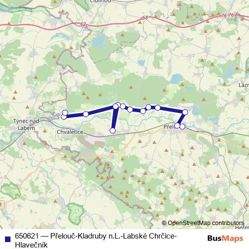 Click here to view the nearest 650621 - Přelouč-Kladruby n.L.-Labské Chrčice-Hlavečník bus stop.