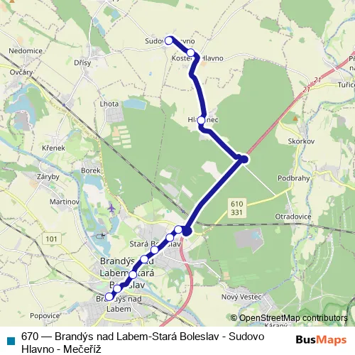 The first stop of the 670 bus route is Brandýs n.L.-St.Bol.,Nádr. and the last stop is Sudovo Hlavno. 670 (Brandýs nad Labem-Stará Boleslav - Sudovo Hlavno - Mečeříž) is operational during denně.
