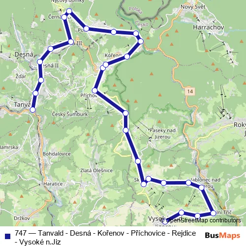 The first stop of the 747 bus route is Vysoké nad Jizerou, náměstí and the last stop is Tanvald, centrum. 747 (Tanvald - Desná - Kořenov - Příchovice - Rejdice - Vysoké n.Jiz) is operational during denně.