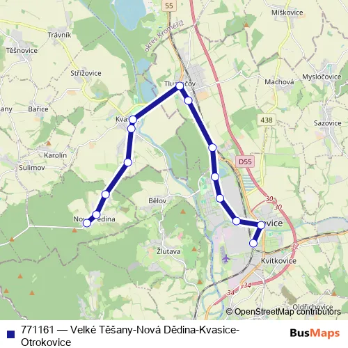 The first stop of the 771161 bus route is Nová Dědina,točna and the last stop is Otrokovice,žel.st.. 771161 (Velké Těšany-Nová Dědina-Kvasice-Otrokovice) is operational during ve všední dny.