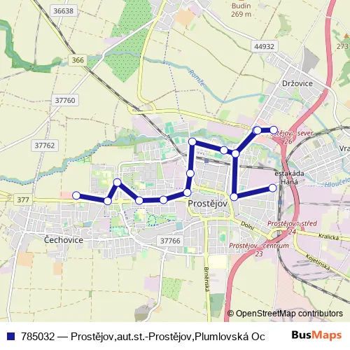 The first stop of the 785032 bus route is Prostějov,nemocnice and the last stop is Prostějov,aut.st.. 785032 (Prostějov,aut.st.-Prostějov,Plumlovská Oc) is operational during denně.