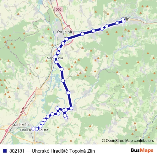 The first stop of the 802181 bus route is Uherské Hradiště,aut.nádr. and the last stop is Zlín,aut.nádr.. 802181 (Uherské Hradiště-Topolná-Zlín) is operational during denně.