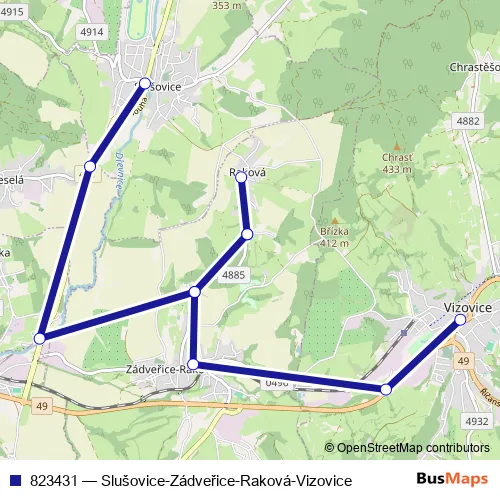 The first stop of the 823431 bus route is Vizovice,náměstí and the last stop is Slušovice,Dlouhá. 823431 (Slušovice-Zádveřice-Raková-Vizovice) is operational during ve všední dny.