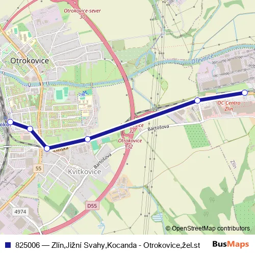 The first stop of the 825006 trolleybus route is Otrokovice, železniční stanice and the last stop is Zlín, Malenovice, Zps. 825006 (Zlín,Jižní Svahy,Kocanda - Otrokovice,žel.st) is operational during denně.