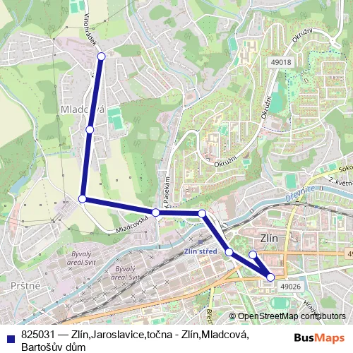 The first stop of the 825031 bus route is Zlín, Mladcová, Bartošův dům and the last stop is Zlín, náměstí Míru. 825031 (Zlín,Jaroslavice,točna - Zlín,Mladcová,Bartošův dům) is operational during denně.
