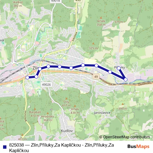 Bus 825038 - Zlín,Příluky,Za Kapličkou - Zlín,Příluky,Za Kapličkou in Zlin: Stops & Timetable