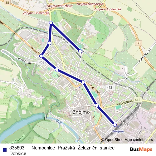 The first stop of the 835803 bus route is Znojmo,Nemocnice and the last stop is Znojmo,žel.st.. 835803 (Nemocnice- Pražská- Železniční stanice- Dobšice) is operational during ve všední dny.