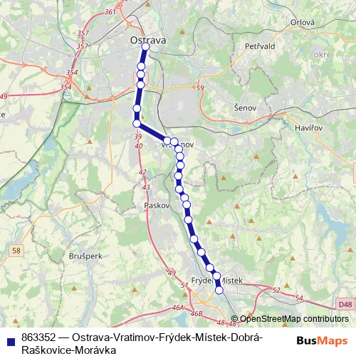 The first stop of the 863352 bus route is Ostrava,Úan and the last stop is Frýdek-Místek,Frýdek,aut.nádr.. 863352 (Ostrava-Vratimov-Frýdek-Místek-Dobrá-Raškovice-Morávka) is operational during ve všední dny.
