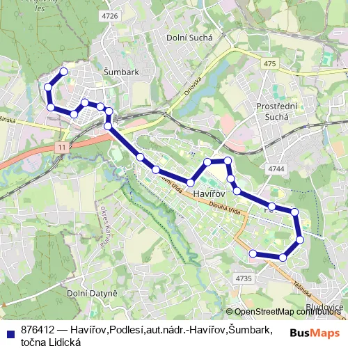 The first stop of the 876412 bus route is Havířov,Šumbark,točna Lidická and the last stop is Havířov,Podlesí,aut.nádr.. 876412 (Havířov,Podlesí,aut.nádr.-Havířov,Šumbark,točna Lidická) is operational during denně.