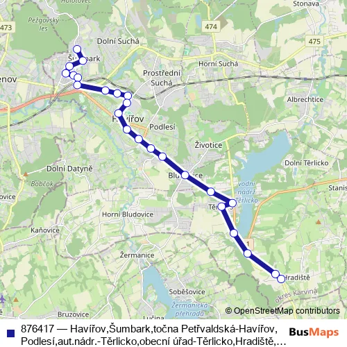 The first stop of the 876417 bus route is Havířov,Podlesí,Těšínská and the last stop is Těrlicko,obecní úřad. 876417 (Havířov,Šumbark,točna Petřvaldská-Havířov,Podlesí,aut.nádr.-Těrlicko,obecní úřad-Těrlicko,Hradiště,U Stonávky) is operational during denně.