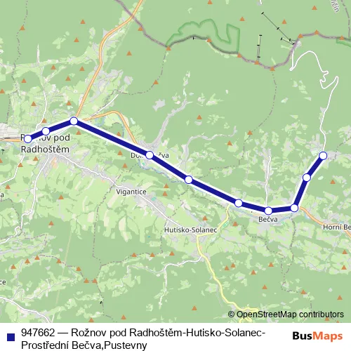 Bus 947662 - Rožnov pod Radhoštěm-Hutisko-Solanec-Prostřední Bečva,Pustevny: Full Schedule in Prostredni Becva