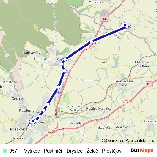 Click here to view the nearest 957 - Vyškov - Pustiměř - Drysice - Želeč - Prostějov bus stop.
