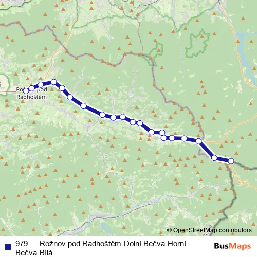 The first stop of the 979 bus route is Horní Bečva, restaurace Na Bečvici and the last stop is Rožnov pod Radhoštěm, autobusová stanice. 979 (Rožnov pod Radhoštěm-Dolní Bečva-Horní Bečva-Bílá) is operational during denně.