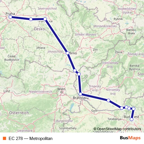 The first stop of the EC 278 rail route is Budapest-Nyugati pu and the last stop is Praha hl.n.. EC 278 (Metropolitan) is operational during denně.