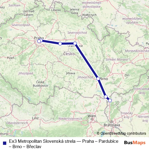 Click here to view the nearest Ex3 Metropolitan Slovenská strela - Praha – Pardubice – Brno – Břeclav rail stop.