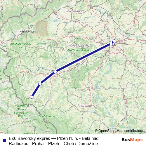 The first stop of the Ex6 Bavorský expres rail route is Praha-Vysočany and the last stop is Domažlice. Ex6 Bavorský expres (Plzeň hl. n. - Bělá nad Radbuzou - Praha – Plzeň – Cheb / Domažlice) is operational during o víkendech.