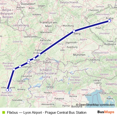 The first stop of the Flixbus bus route is Prague Burger King Florenc Bus Station and the last stop is Lyon Saint Exupéry Airport T3. Flixbus (Lyon Airport - Prague Central Bus Station) is operational during denně.