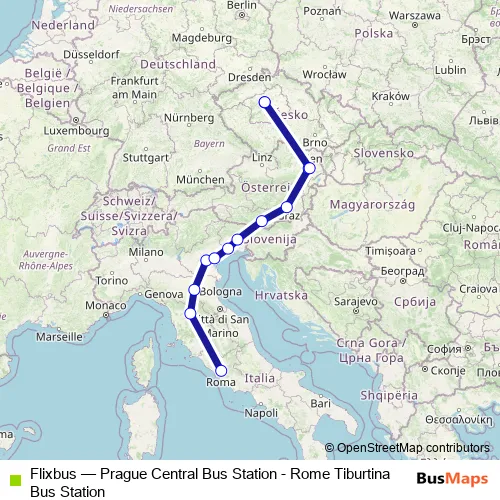 The first stop of the Flixbus bus route is Rome Tiburtina Bus station and the last stop is Prague Burger King Florenc Bus Station. Flixbus (Prague Central Bus Station - Rome Tiburtina Bus Station) is operational during denně.