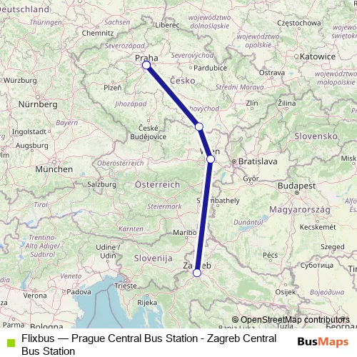 The first stop of the Flixbus bus route is Prague Burger King Florenc Bus Station and the last stop is Zagreb Central Bus Station. Flixbus (Prague Central Bus Station - Zagreb Central Bus Station) is operational during denně.