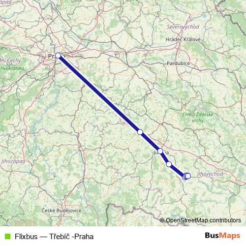 The first stop of the Flixbus bus route is Prague, Prague ÚAN Florenc and the last stop is Třebíč, Třebíč,Hotel Atom. Flixbus (Třebíč -Praha) is operational during denně.