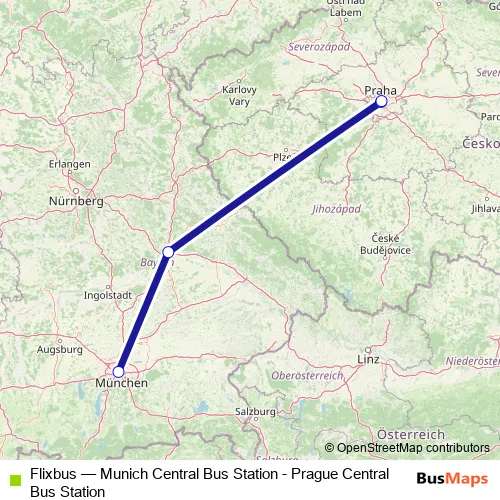 The first stop of the Flixbus bus route is Munich Central Bus Station and the last stop is Prague Burger King Florenc Bus Station. Flixbus (Munich Central Bus Station - Prague Central Bus Station) is operational during denně.