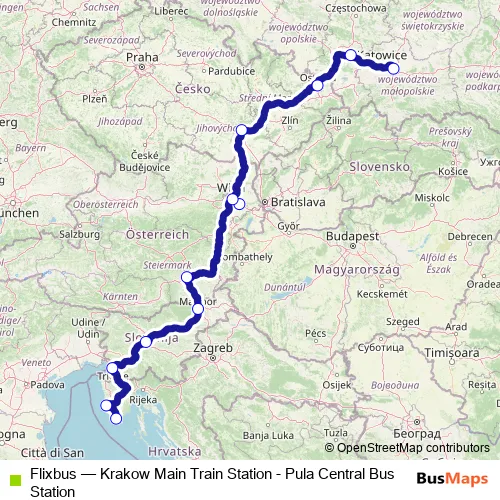 The first stop of the Flixbus bus route is Krakow Central Bus Station and the last stop is Pula Bus Station. Flixbus (Krakow Main Train Station - Pula Central Bus Station) is operational during denně.