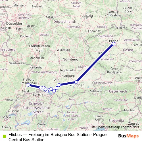 The first stop of the Flixbus bus route is Prague Burger King Florenc Bus Station and the last stop is Freiburg im Breisgau Bus Station. Flixbus (Freiburg im Breisgau Bus Station - Prague Central Bus Station) is operational during denně.