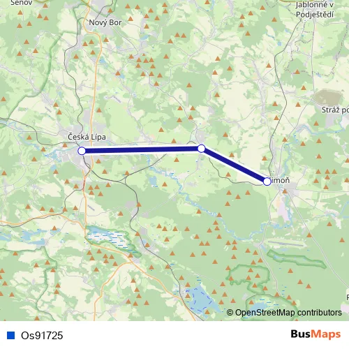The first stop of the Os91725 rail route is Česká Lípa hl.n. and the last stop is Mimoň. Os91725 is operational during ve všední dny.