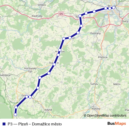 The first stop of the P3 rail route is Plzeň hlavní nádraží and the last stop is Domažlice město. P3 (Plzeň – Domažlice město) is operational during denně.