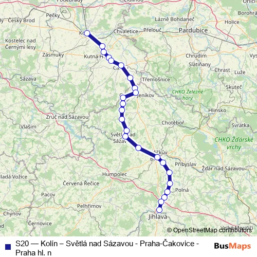 The first stop of the S20 rail route is Kolín and the last stop is Jihlava. S20 (Kolín – Světlá nad Sázavou - Praha-Čakovice - Praha hl. n) is operational during denně.