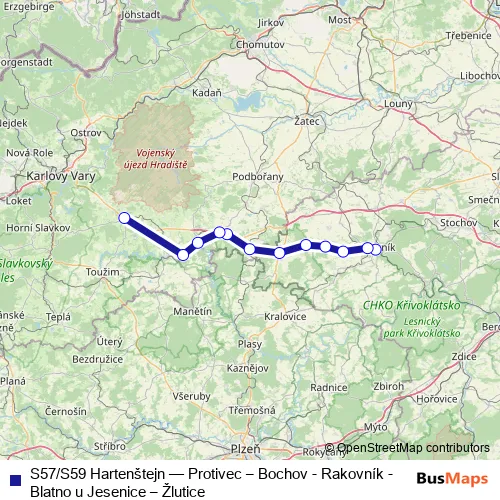 Click here to view the nearest S57/S59 Hartenštejn - Protivec – Bochov - Rakovník - Blatno u Jesenice – Žlutice rail stop.