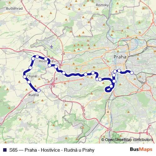 The first stop of the S65 rail route is Rudná u Prahy and the last stop is Praha-Vršovice. S65 (Praha - Hostivice - Rudná u Prahy) is operational during denně.