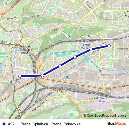The first stop of the X92 bus route is Praha, Špitálská and the last stop is Praha, Palmovka (terminál Bus). X92 (Praha, Špitálská - Praha, Palmovka) is operational during denně.