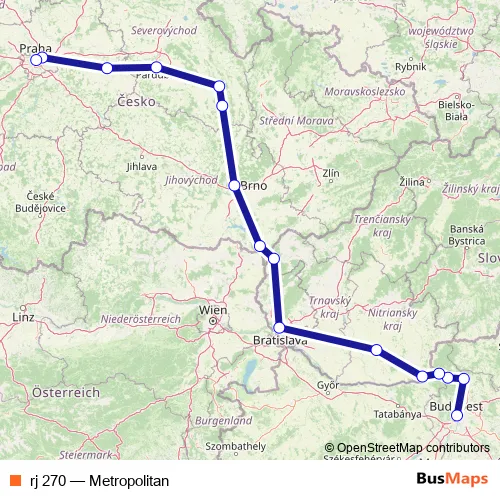 The first stop of the rj 270 rail route is Budapest-Nyugati pu and the last stop is Praha hl.n.. rj 270 (Metropolitan) is operational during denně.