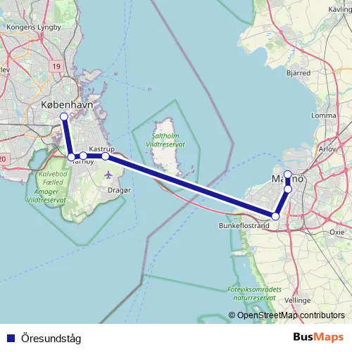 The first stop of the Öresundståg rail route is Köpenhamn H and the last stop is Copenhagen Airport. Öresundståg is operational during hver dag.