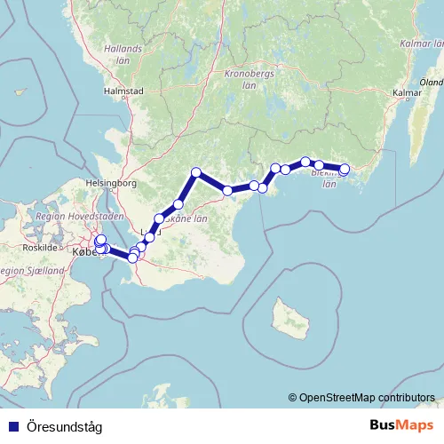 The first stop of the Öresundståg rail route is Karlskrona Centralstation and the last stop is Köpenhamn Österport. Öresundståg is operational during hver dag.