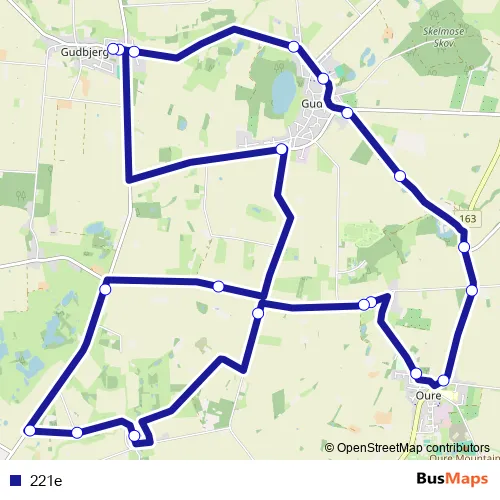 The first stop of the 221e bus route is Stokkebækskolen / Gudbjerg (Svendborg Kommune) and the last stop is