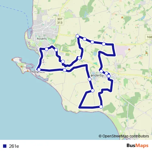 The first stop of the 261e bus route is Ebberup Skole (Assens Kommune) and the last stop is