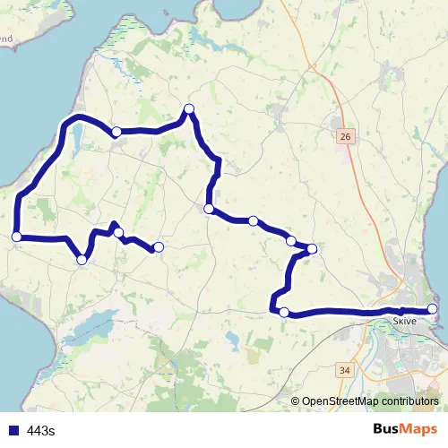 The first stop of the 443s bus route is Skive Festivalen/Havnevej (Skive Kom) and the last stop is Ramsing (Skive kom). 443s is operational during hver dag.