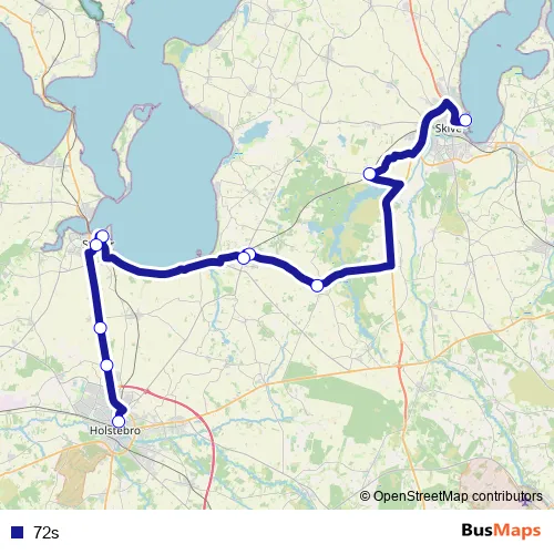 The first stop of the 72s bus route is Skive Festivalen/Havnevej (Skive Kom) and the last stop is Holstebro Trafikterminal. 72s is operational during hver dag.