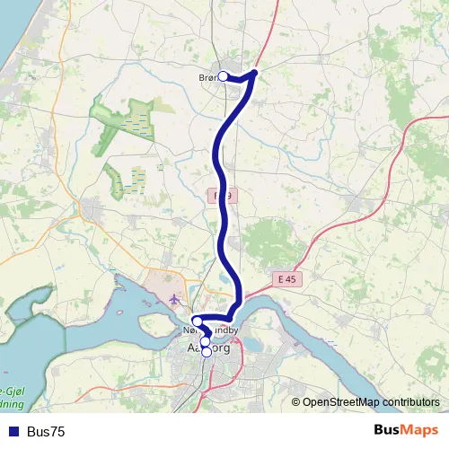 The first stop of the Bus75 bus route is Aalborg St. (Område C / Regionalbus) and the last stop is Brønderslev St.. Bus75 is operational during hver dag.