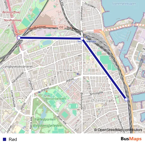 The first stop of the Rød bus route is Nordhavn St. (Østbanegade) and the last stop is Ryparken St. (Lyngbyvej). Rød is operational during i weekender.