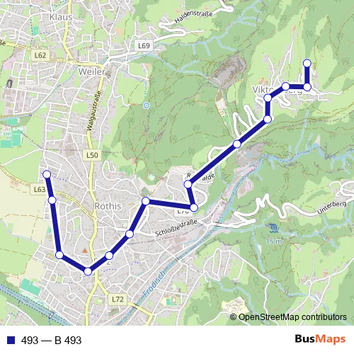 The first stop of the 493 bus route is Röthis, Alte Landstrasse and the last stop is Viktorsberg, Hotel Viktor. 493 (B 493) is operational during an Werktagen.