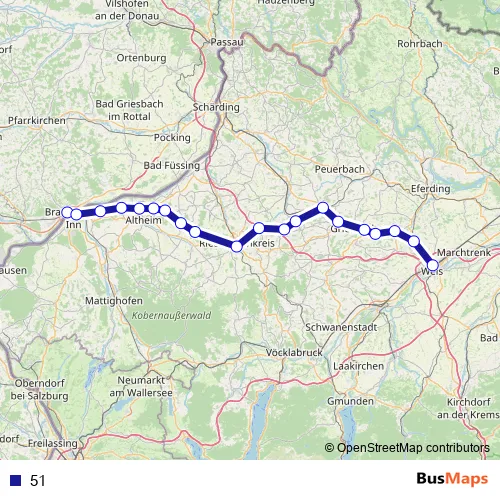 The first stop of the 51 rail route is Simbach(Inn) and the last stop is Wels Hbf. 51 is operational during täglich.