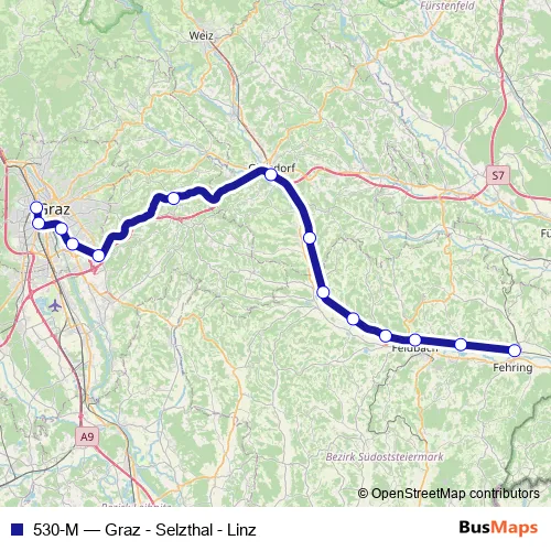 The first stop of the 530-M rail route is Graz Hbf 1F-H and the last stop is Fehring. 530-M (Graz - Selzthal - Linz) is operational during täglich.