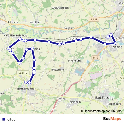 The first stop of the 6185 bus route is Pocking and the last stop is