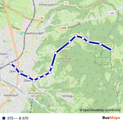 The first stop of the 870 bus route is Dornbirn, Bahnhof and the last stop is Schwarzenberg, Bödele. 870 (B 870) is operational during täglich.
