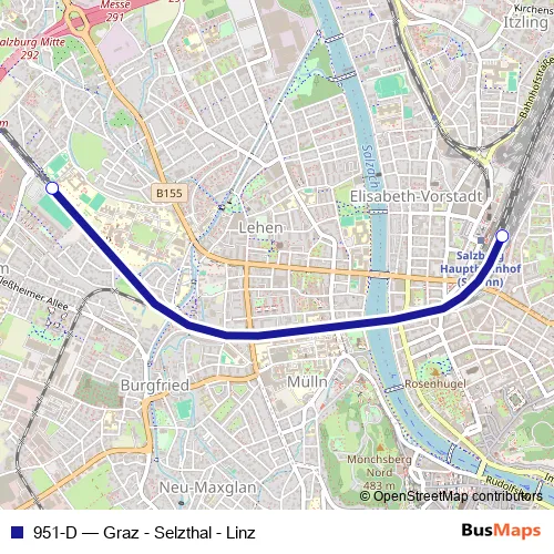 The first stop of the 951-D rail route is Salzburg Taxham Europark S-Bahn and the last stop is Salzburg Hauptbahnhof. 951-D (Graz - Selzthal - Linz) is operational during täglich.