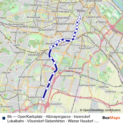 Click here to view the nearest Bb - Oper/Karlsplatz - Aßmayergasse - Inzersdorf Lokalbahn - Vösendorf-Siebenhirten - Wiener Neudorf - Baden Landesklinikum - Baden Viadukt Baustelllenfahrplan vom 1.5. - 03.05.2026 tram stop.